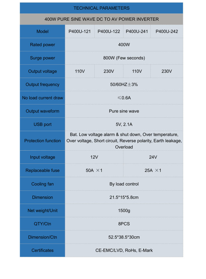 400W Pure Sine Wave DC till AC Power Inverterare